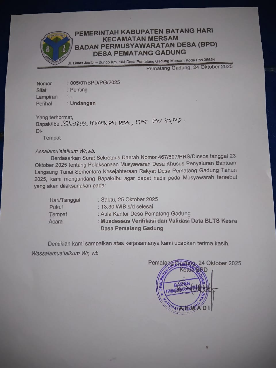 Musdesus Verifikasi dan Validasi Data BLTS Kesra Desa Pematang Gadung